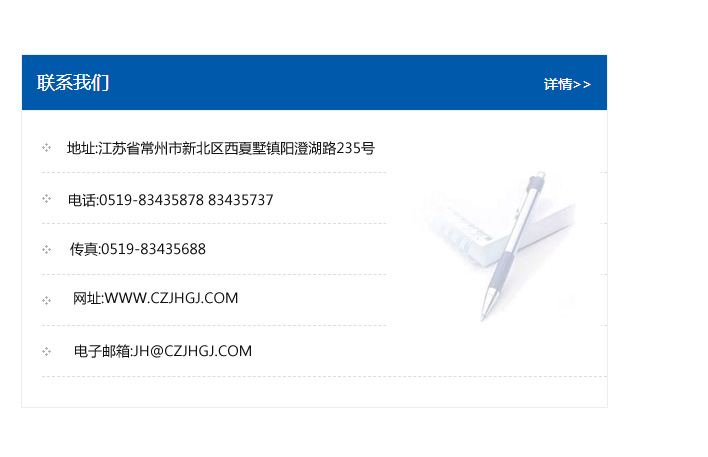 地址:常州市新北區友邦商務大廈1幢16、17層  電話:0519-85101652  傳真:0519-85112595  郵編:213022  網址:www_cz-jiayue_cn.qrw3.com  郵箱:xiajifengaa@163.com